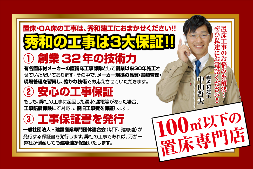 弊社は、「OA床工事を責任施工で丸投げしたい」「工期を短縮したい」「他社がやりたがらない面倒な工事を何とかお願いしたい」といった、あらゆるお悩みにお応えします。